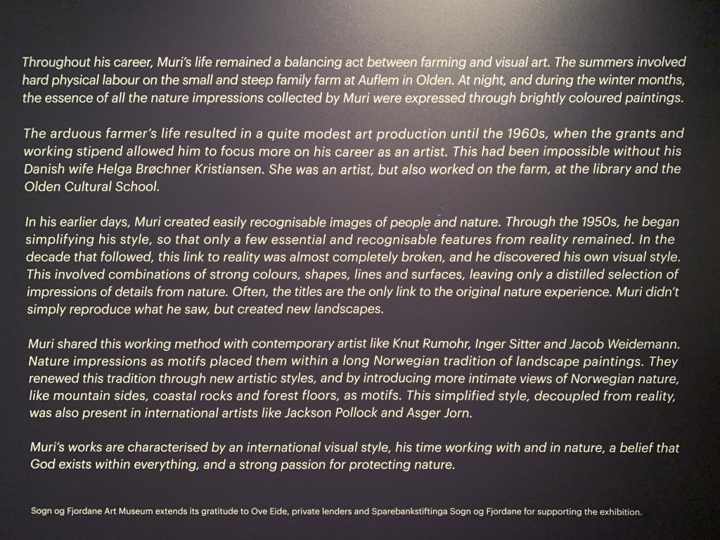 Born in Ålesund and grew up in Gjøvik. During the Second World War, he lived with his uncle Andreas at Auflem in Olden, in order to evade forced Nazi labour. Studied at the Norwegian Academy of Fine Arts in Oslo from 1946-1948. After further training, Muri married the Danish artist Helga Brøchner-Kristiansen, whom he had met in Copenhagen in 1946. They took over the family farm at Auflem, where they raised cows, sheep, pigs, chickens and horses, as well as growing fruit.