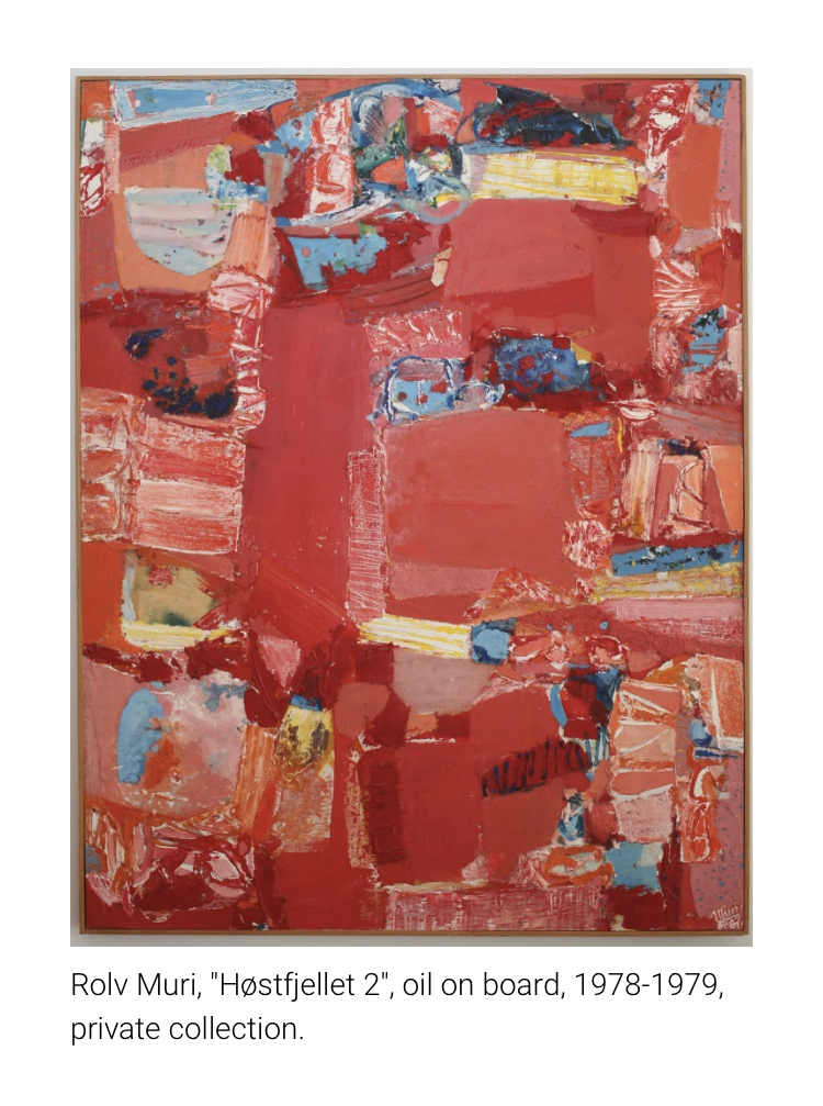 Throughout the 1960s, Muri represented his home country in two major official Norwegian exhibitions abroad. He was included in the Vestland Exhibition thirteen times, and at the Autumn Exhibition five times. He was also awarded a three-year working stipend. This allowed him to prepare for his first solo exhibition in 1969 – 25 years after his first exhibition. In addition, some of his work was bought by the National Gallery. In 1977, Muri was one of the first artists to be granted a guaranteed working income by the government.