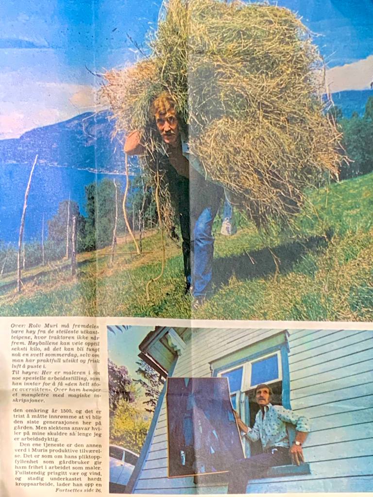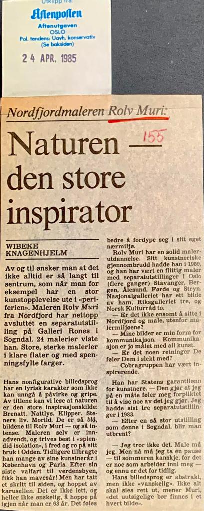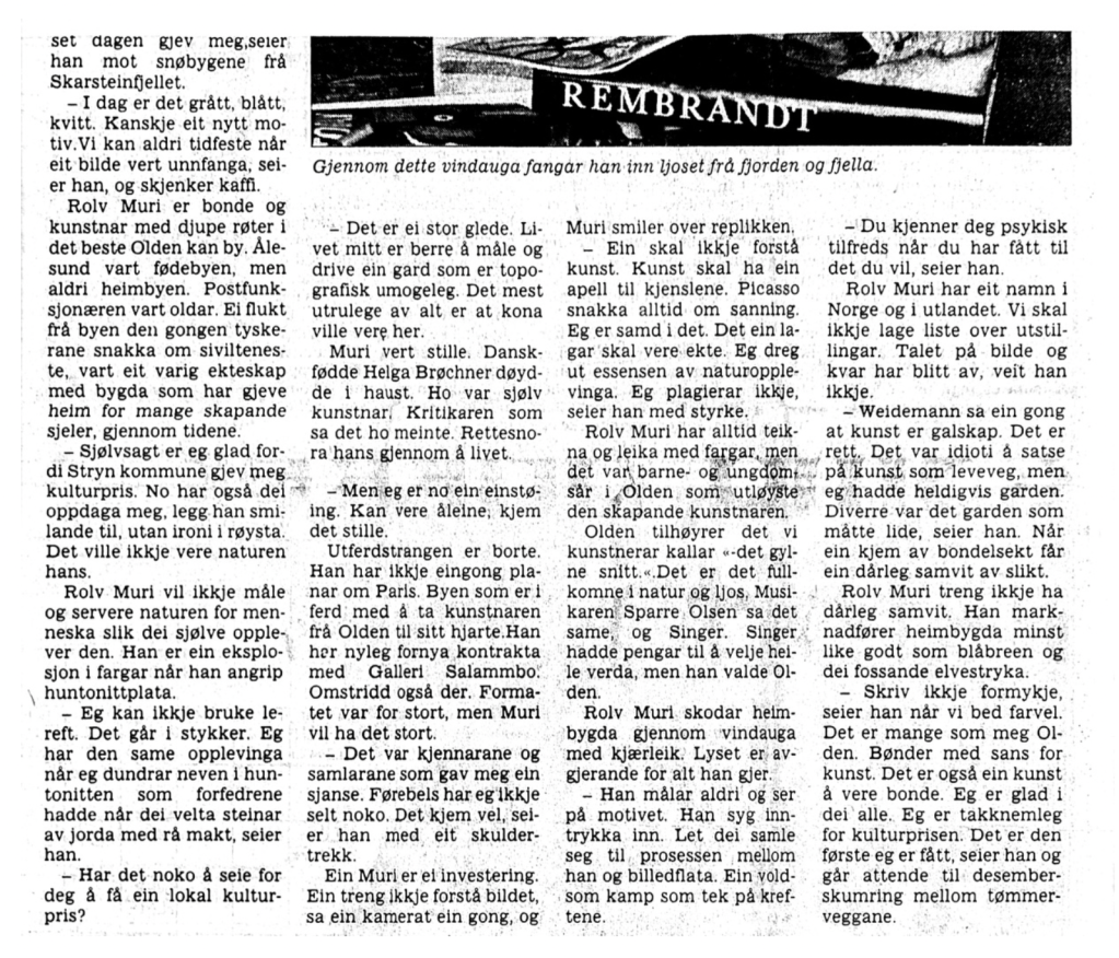 “Vegen frå amatør til profesjonell var ei reise frå Olden til Oslo og Europa – og tilbake att til landsbygda. Rolv Muri bygde eit kunstnarliv og ei kunstnar-karriere på eit småbruk langt frå nasjonale kunst- og kultur-institusjonar. Det var her han fann seg sjølv, i nokre større samanhengar: garden, slekta, naturen. Men livet som bonde hadde sin pris, arbeidet i onnene måtte gjerast når tida var der, kunsten måtte vente. I dette låg det eit fruktbart paradoks: Somrane var «ei eldkule av slit og sveitte», sa han, men det var dette kvardagslivet som la grunnlaget for kunsten hans: «…det er i einsemda på småbruket eg har funne gullkorna og inspirasjonen» (frå eit intervju i Sogn og Fjordane Magasin 1988) – Tekst Ove Eide