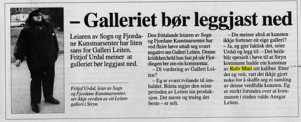 Er tida moden for eit permanent kunstgalleri i Stryn Kommune? Økonomiske utfordringar står i kø i kommunen på fleire felt, men det er likevel ein spennande tanke. Med dei lokale kunstnarane som Rolv Muri og Kaare Sunde med fleire burde dette absolutt kvalifisere for eit galleri. Opprettelsen av Leiten galleri kan vel i ettertid diskuterast (sjå Urdal sin kommentar) men eg vil løfte blikket framover. Har opna opp for idéen med Kulturkontoret i Stryn som er positive til å få til eit samarbeid om dette. Kaare Sunde samlinga som Stryn Kommune har fått er dessverre ikkje tatt godt nok vare på, og dette må gjerast noko med. Vi får sjå om det er mogleg å få til noko i dei same lokala som Leiten Galleriet disponerte i kjellaren på Stryn Kulturhus. Stryn Kunstlag, Stryn Kulturkontor, Stryn Kulturhus og Sogn og Fjordane Kunstmuseum er naturlege samarbeidspartnarar.